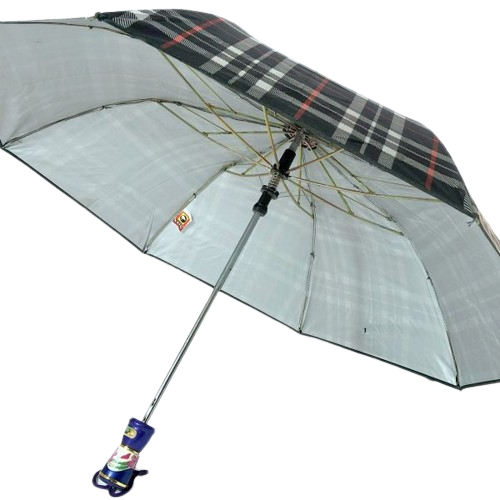 21X8 TWO FOLD AUTO CHECK SILVER UMBRELLA. SINGLE PRESS AUTO OPEN FUNCTION. SUPERFINE WATERPROOF FABRIC. SPECIAL SILVER COATING FO UV PROTECTION.