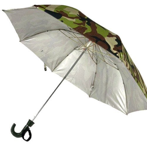21 inch 8k two fold manual army silver umbrella. Superfine waterproof fabric. Special silver coating for UV protection. High quality metal ribs. Easy manual open-close function.